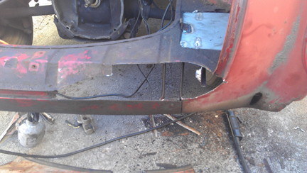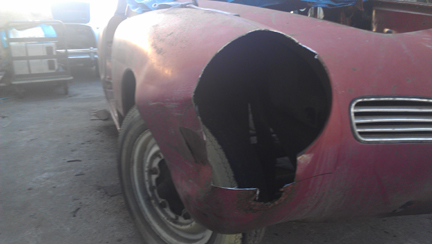 AT RIGHT: Scarlet's nose in mid-metalwork phase. The right headlamp and turn signal area is welded in, but the left hasn't yet even been tacked into place, much less welded fully. Dents in the nose have been gently removed...