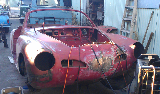 Around 2005, Mrs. Balazs decided to sell the remants of the house and lands, and the garage with, and the young Miss Balazs decided she had to rescue the Karmann Ghia Cabriolet she had enjoyed as a child. She contacted me for advice and later decided to send it here because I was the only one whose advice was focused on her needs, not their own. And, she (correctly) figured I knew what to do with her.