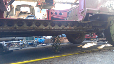 AT RIGHT: The left rocker is seen immediately following the removal of the outer skin and before any (additional) repair activities have been performed. What's remarkable here is just how good the rockers are! They did NOT receive paint from Karmann, rather, the pieces were primered before they were welded in and the body was dipped in a vat of primer. (Keep in mind, primer isn't paint!) And, water drains through the rocker, so their survival is remarkable!