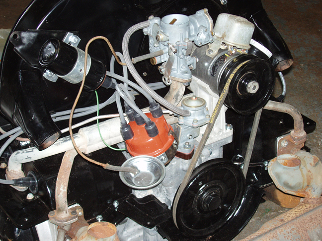 AT RIGHT: Scarlet's original engine, rebuilt and ready for service, about to be installed. Here, it looks beautiful, but be sure to click over to the Initial Rebirth page to see what this engine looked like BEFORE the rebuild! Also note that every single part on her that could possibly be made serviceable that's not a commodity item (like the spark plug wires) is the orignal from this car. So yes, that's the original fuel pump, carburetor, etc.