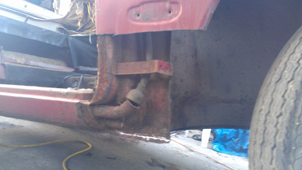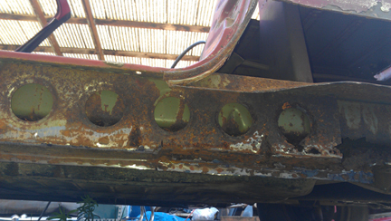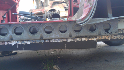 Here's the front's inner structure is now complete and painted in enamel, and the perpendicular plate discussed above is also installed. And here's a better shot of the rear-most stainless steel addition to the left rocker. Unfortunately, it doesn't appear that an image was taken of the one just forward of this, but another similar piece was added covering the last two large holes of the original stiffener. ... An additional extension down low was installed during the installation of the outer skin.