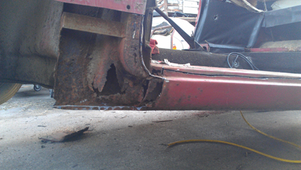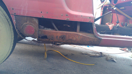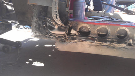 On the right, the pieces of fender which cover the rocker region were both removed to gain acess. Once done it was realized that the right hand rocker was in very much better condition, and it was decided to cut away a large fraction of the rocker panel underneath the rear fender for exploratory purposes and see what the condition underneath was like.