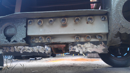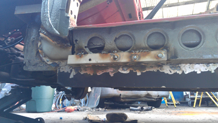 The left side was unequivocal: all the outer skin had to go. Once exposed, as can be seen below, much of the original stiffener was in good condition, but some was rotten. The worst bits were removed as simple debris then POR-15 was applied. Once done, stainless steel was used to in essence patch the original metal, as can be seen in the images. There's a plate that runs perpendicular to the fore / aft axis of the vehicle which was fabricated and installed, carefully fitted - this piece was made to fit the original structure perfectly, but a bit large on the outer edge, so it could be gently altered, a little at a time, for perfect fit to the outer skin.