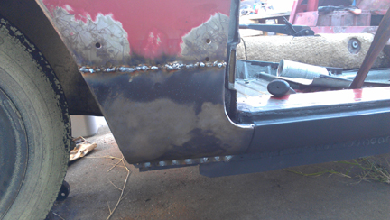 After the internals were repaired, the outer skin for the center part of the rocker (which goes under part of both front and rear fenders) was fitted. First, holes were drilled at appropriate locations in the aproximate locations of the original spot welds the factory used. Then, in fitting the piece, it was recognized that the repair panel protrudes much further downward than the original, in the neighborhood of one half to three quarters of an inch. This is a large difference. In order to have some place to weld to, the lower edge had to be extended downward using an additional piece of metal. This was done before actually attaching the rocker skin whatsoever so that the addition could be fully welded and have the welds ground smooth. It was then painted for rust protection, of course.