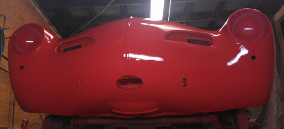 Presuming you viewed all the images leading to this point, "before", "initial rebirth", and especially if you consider some of the images below, there are quite a few things to notice in the image at right. First, notice the reflection of the flourescent lamp bulbs in the right rear fender panel, just above the tire - they're as straight as you can hope for, especially given the damage in that area. Similarly, the right corner of the engine bay has been reconstructed. And, the big - make that huge! - dent at the top of the rear tip of the right rear fender is virtually perfect (look for the shiny spot above the right tail lamp).