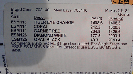 ABOVE RIGHT: Scarlet's paint's formula of Ruby Red, L456, as implemented in the PPG Delfleet Essential series Single Stage polyurethane enamel - a water-soluable paint. INRETROSPECT... I think, given the extra orange tint and not enough blue tint, the fellow who helped us obtain this paint match ACTUALLY had a Pelican Red car, and not Ruby Red!