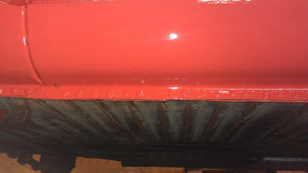 The engine bay had several issues. Not only was the entire battery tray area replaced, but there were patches in several places, and the entire right side of the beveled section where the horizontal metal meets the decklid seal groove - including a fair percentage of the seal's groove - was also replaced. In the image at right and the two that follow, the repair is nearly invisible - you only see it if you know exactly where to look and what to look for.