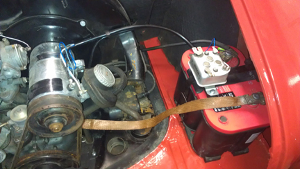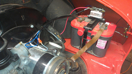 ABOVE LEFT AND RIGHT: Here the 12v conversion at the power source can be seen. The battery retaining strap includes a mount for the voltage regulator. Both the regulator and the generator are new, modern Bosh products. The image at left shows the original configuration with the original Optima I had chosen. The image at right shows the second configuration with the different Optima (still 12v) which allowed the regulator to be better protected under the edge of the fender. ALSO NOTE that in the image above left you can clearly see the clearance between the generator and carburetor - other people have a problem with the fit here, prompting some to use a spacer between the carburetor and manifold to raise the carb up so it doesn't strike the larger diameter 12v generator. But Scarlet doesn't have that problem!