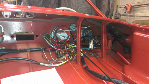 Then, working from the left, the wiring components were installed, starting with the key switch (ignition), including a new rubber grommet that goes into the dash right where the switch goes through it. The gauges were left out for ease of access for the time being and the headlight switch was installed.