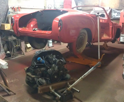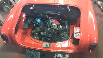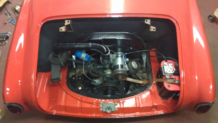 ABOVE LEFT AND RIGHT: Scarlet's original engine, converted to 12v but otherwise with all her original from new parts gets installed once more.In image at left, the sound deadening insullation material covering the rear lid hinges are installed, but the closing panel for the engine bay - sometimes called the breast plate - is not yet installed.