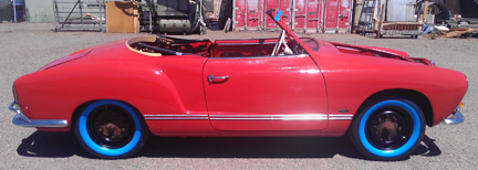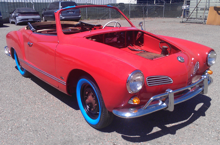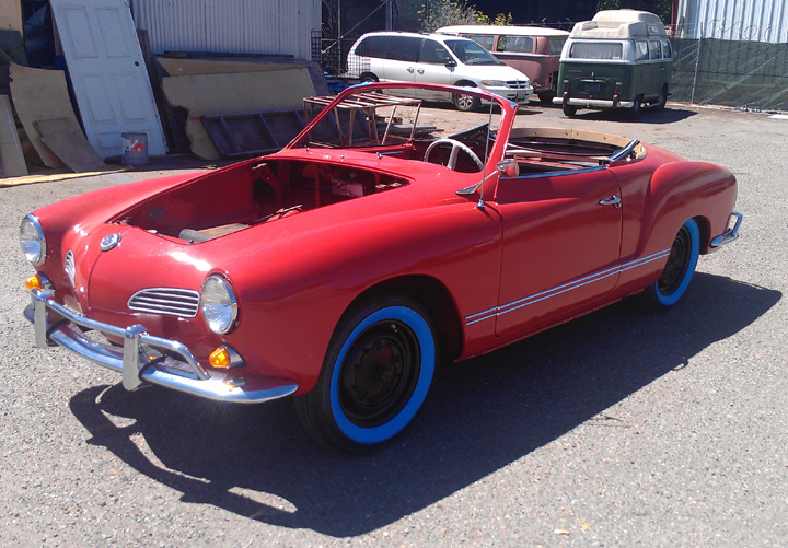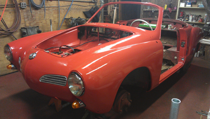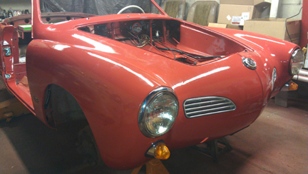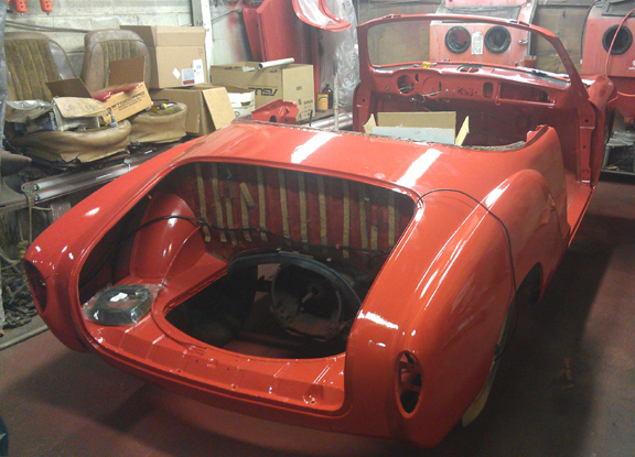 Anyway, when she came back after the first trip, I completed her - only leaving off the items that would get into CA Cover's way doing the upholstery like the glovebox, front lid, etc. (access for the dash and front glass). This involved installing the Antenna, the Driver's Mirror, completely assembling the doors (hinges, check rods, latches, alignment, glass, etc), assembling and installing the license light pod, bumpers, exterior trim, etc. Here she is being brought back to CA Covers a second (or was it third?!) time! You can see all this work completed - headlight ring left off as a reminder to adjust the headlamps: