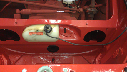 AT RIGHT: Here's the new dual circuit upgrad master cylinder assembly. The master was painted black to protect it from rusting - a purely cosmetic asthetic! The reservoir "snaps in", and is fed by a second reservoir, in this case the original one! A new brake line is fitted to the left front wheel, the rear line is adjusted only a little to fit, and the right front is served from a line taken from a younger Karmann Ghia.