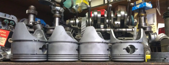 We start with ensuring the pistons are not cracked or otherwise broken, that the ring grooves fit new rings properly, and that they're not worn or scuffed. A thorough cleaning begins the process - we usually use baking soda as it's very soft on the metal but does a good job at cleaning.