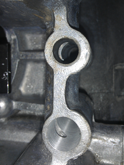 Whatever caused it, the damage was shallow, and the lower part of the bore went unscathed. A lifter inserted in there DID ride OK and didn't appear to have perceptibly more play than non-injured one, and there was some sign someone ha run a lifter in there after whatver went wrong. ...The lifter bore is some 50mm tall (about 2 inches) and the damage was only in the upper 10mm or so, roughly down to the cross-drilled oil passage. Here you can see it.