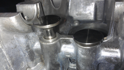 AT RIGHT: Very curious damage at the top 10mm or so of the lifter bore of exhaust #4. Note how deeper in the bore is OK. How it happened is a complete mystery.